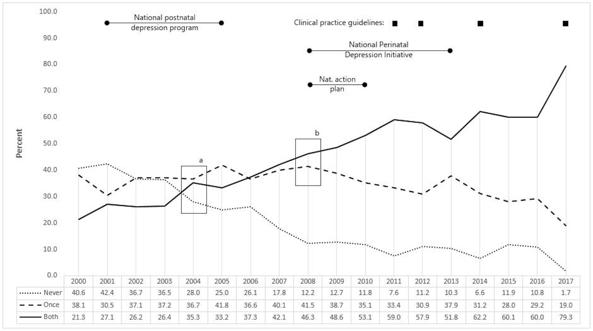 We asked mothers whether a health professional had asked them any questions about their emotional well-being, including completing a questionnaire. We mapped screening rates between 2000 and 2017 and compared them to policy initiatives and clinical practice guidelines.